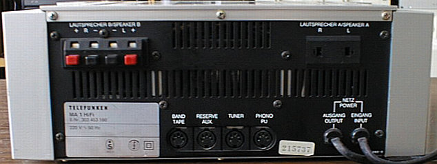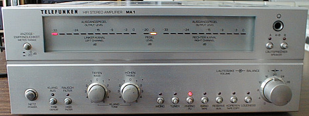 The MA 1 was Telefunken's high-class amplifier offering in the line of Midi-sized (30x30 cm basic area) Hifi components. Compared to its size, it offers a quite respectable output power of 2x50W RMS and almost all features one would expect from an amplifier at that time, including a power level meter with selectable range. It is part of the M 1 component system, and shares the unusual housing concept: the housing is made of an inner frame, and aluminium profiles attached to it make the 'outer skin'. This housing concept is similar to laboratory devices and in contrast to standard housing concepts of Hifi devices at that time, which were based on bended metal sheets. It gives the whole system a very worthy look, and Telefunken won an industry design award for it. But even among the other M 1 components, the MA 1 looks unconventional with its exposed heatsinks on both sides.